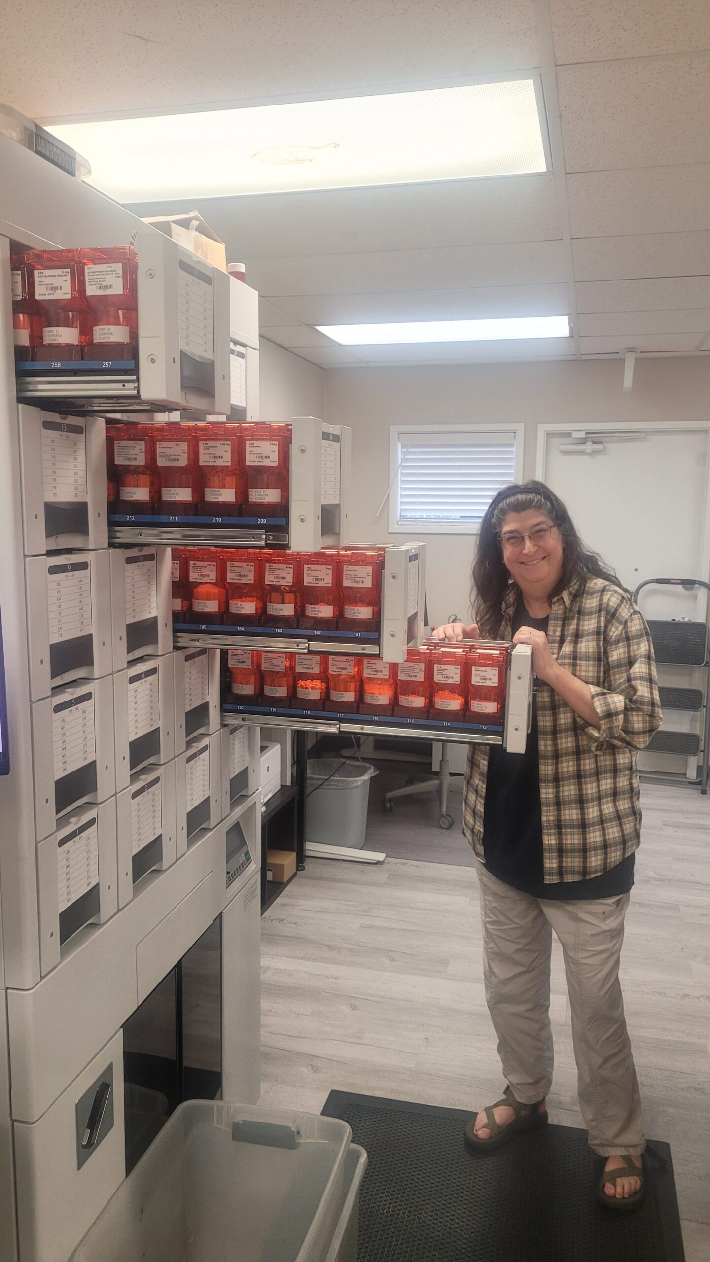 Anne poses with a piece of pharmacy equipment which allows medications to be labeled and packaged for ease of delivery